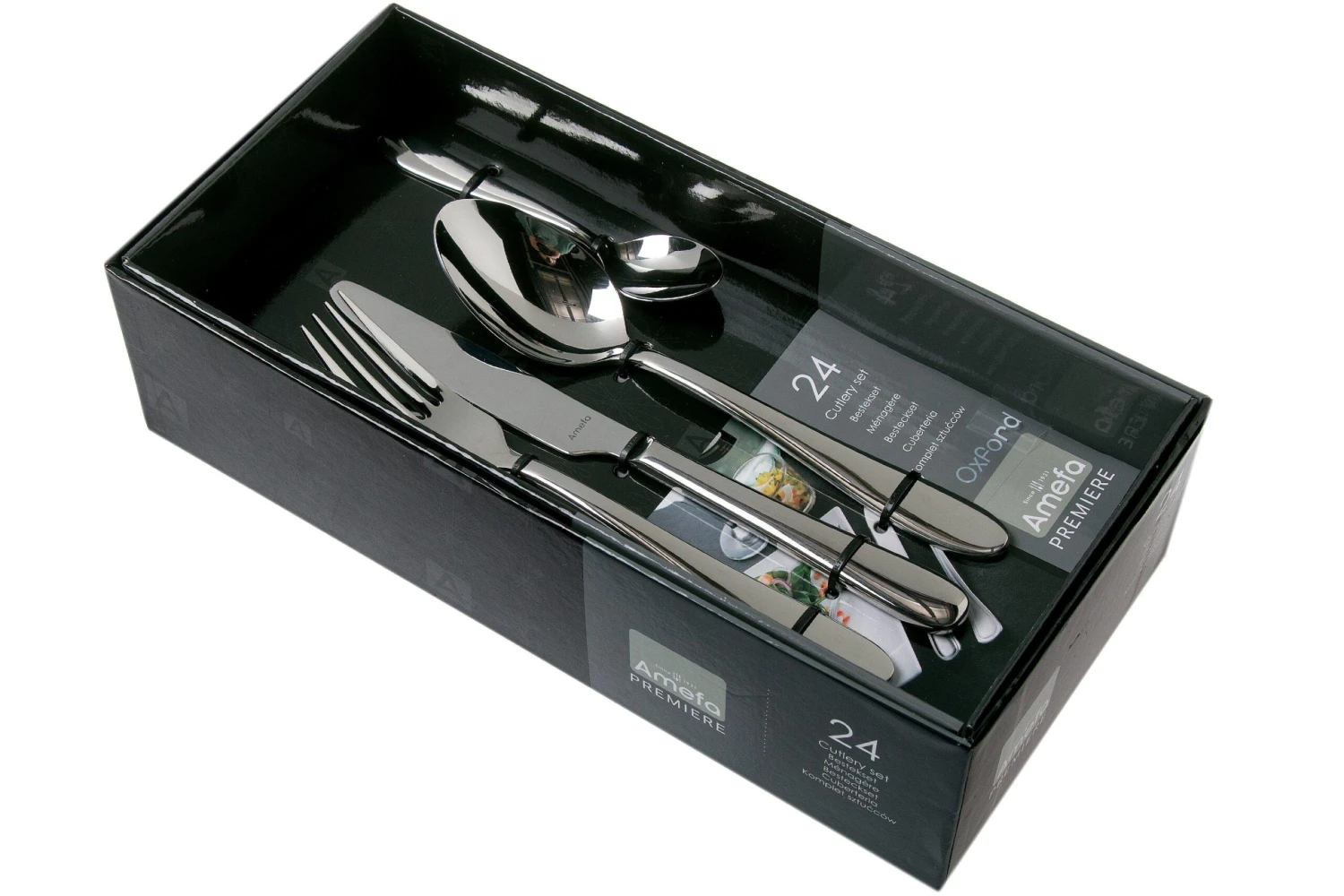L’Amefa Oxford est un modèle de la collection Premiere. Ici, la qualité se pare de designs exclusifs et fonctionnels Avec ses formes élégantes, ce modèle Oxford est un peu différent du modèle traditionnel. Son design moderne est tourné vers l’avenir. Cette collection a été réalisée avec beaucoup de soin et de précision en chrome-nickel, plus connu sous le nom d’acier inoxydable 18/10. Cette collection est donc très résistante à la rouille et aux tâches. Ces modèles peuvent même aller au lave-vaisselle.