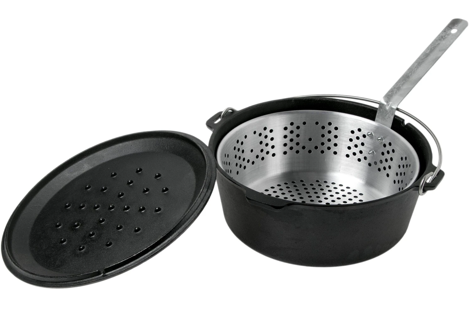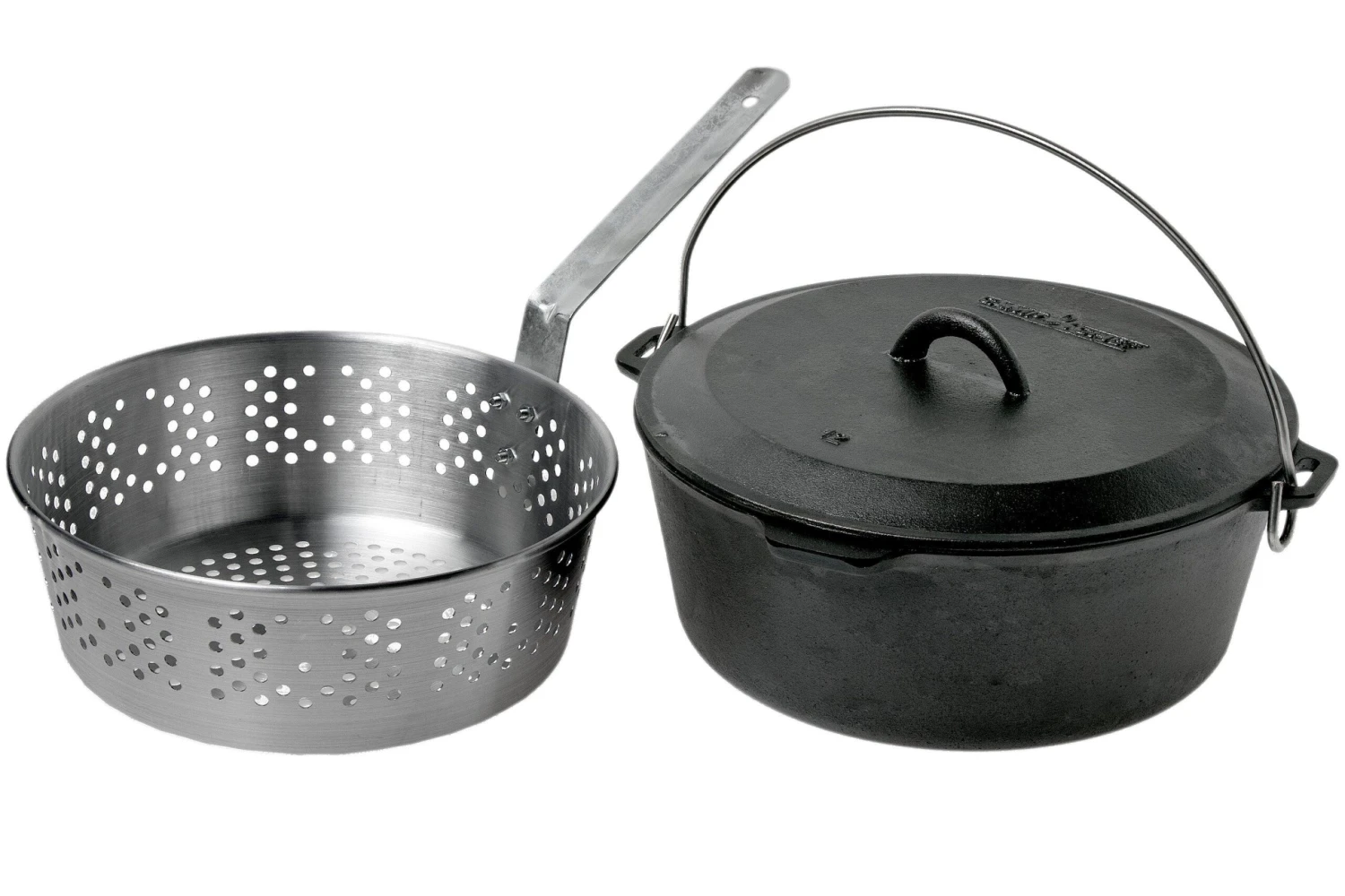 GrĂące Ă cette friteuse Camp Chef, prĂ©parez vos snacks prĂ©fĂ©rĂ©s : frites, beignets, et autres produits de friture. Ou utilisez-la simplement comme marmite pour cuisiner (en extĂ©rieur). Sur le feu de camp, sur une gaziniĂšre ou dans le four. La marmite n’a pas de pieds et se pose de façon stable sur une grille de four ou sur une gaziniĂšre. Les propriĂ©tĂ©s uniques de la fonte garantissent une excellente rĂ©partition de la chaleur. Elle est livrĂ©e avec un panier de friture avec poignĂ©e et un couvercle. La fonte a Ă©tĂ© traitĂ©e selon le traitement ‘true Seasoned Finish’. La finition est donc lisse et les ustensiles de cuisson sont immĂ©diatement prĂȘts Ă l’emploi.