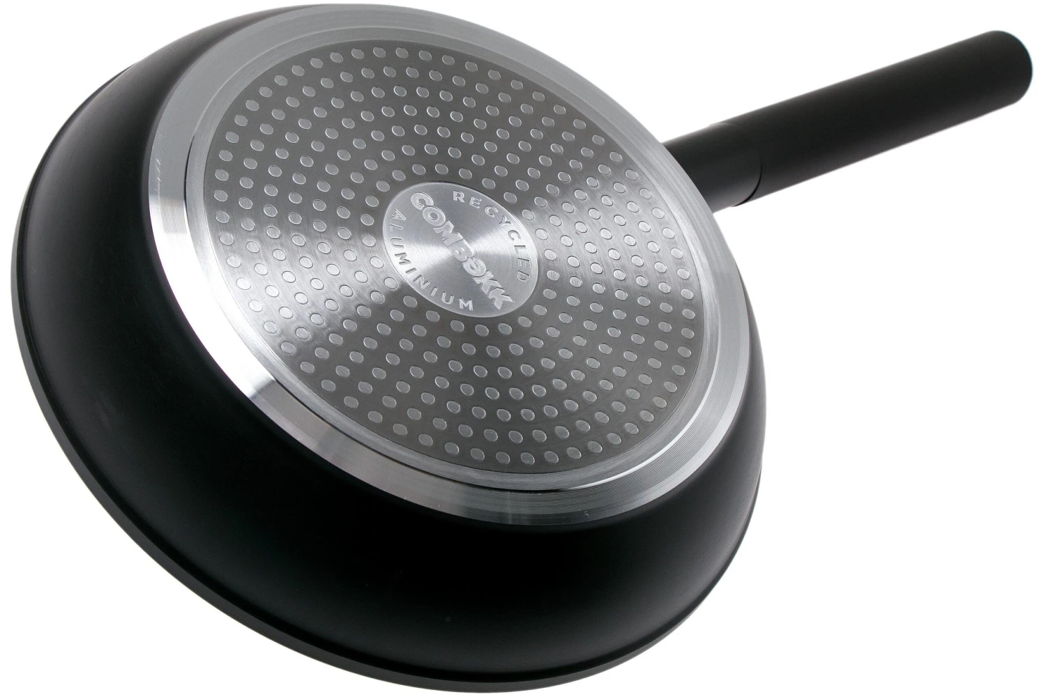 La poêle Combekk Alu-X est une poêle originale de fabrication néerlandaise. C’est la toute première poêle faite en aluminium recyclé avec fond en céramique. On remarque la forme « lyonnaise » de son design : ses bords sont un peu plus hauts qu’une poêle classique et sont arrondis. Faire sauter les ingrédients devient un peu plus facile. La poêle est donc idéale pour réaliser des plats complets. Le gros manche rond (fait à 100% de nylon recyclé) tient bien en main et ne chauffe pas. Sa longueur permet de garder la main loin de la source de chaleur. Cette poêle présente un diamètre de 24 centimètres (mesuré sur le bord haut). En principe, cela signifie que l’on peut réaliser des plats pour 2 personnes.