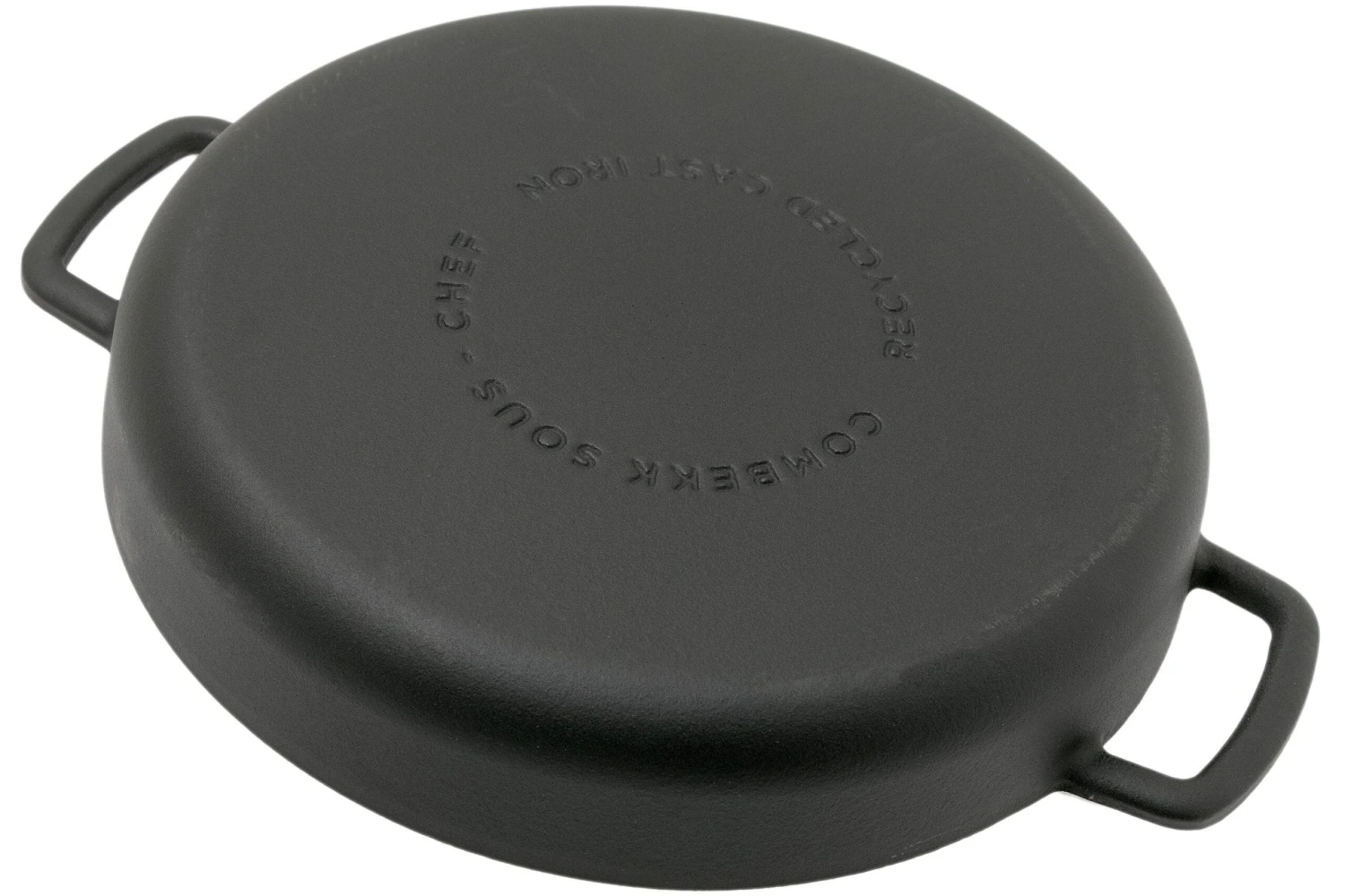 Cette poêle Combekk Sous Chef noire a un diamètre de 28 centimètres. Ce modèle et ses deux poignées sont en fonte 100% recyclée. Elle est pourvue d’un revêtement émaillé, et ne contient aucun PFAS, PFOA ni PTFE.