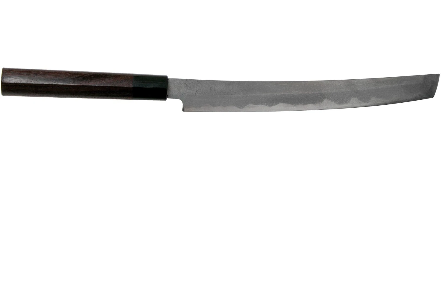 L’Eden Takobiki Ryoba 24 cm est une impressionnante Ă©pĂ©e de samouraĂŻ pour votre cuisine. Avec une longeur de lame de 24 cm, tranchez les plus fins sashimis d’un mouvement souple !