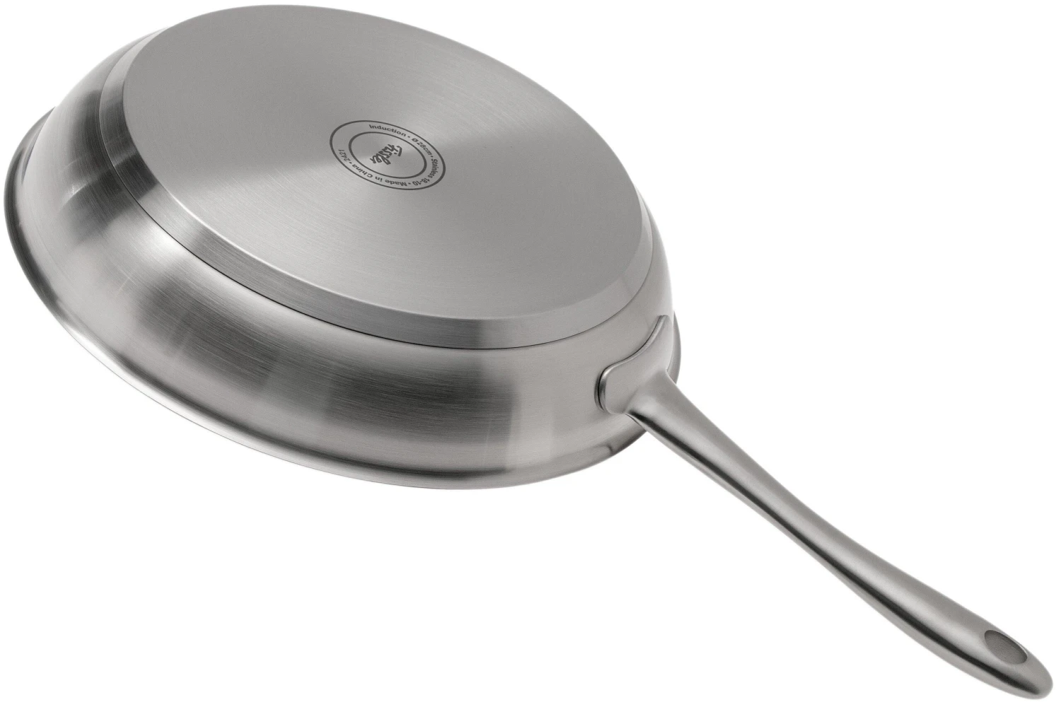 La poêle 28 cm Fissler Catania est une grosse poêle de qualité pour un usage polyvalent et professionnel. Le fond d’une épaisseur de 6 mm présente une conductivité thermique élevée. La poêle va vite chauffer et la chaleur va bien se répartir et bien se conserver au niveau du fond. La longue poignée de cette poêle ne chauffe pas et offre un excellent contrôle pendant la cuisson.