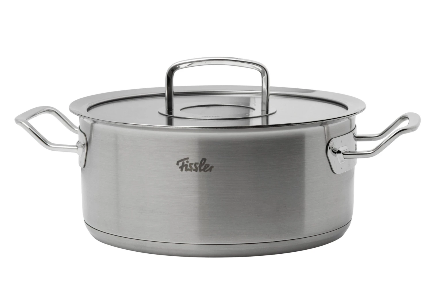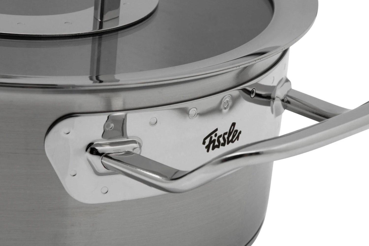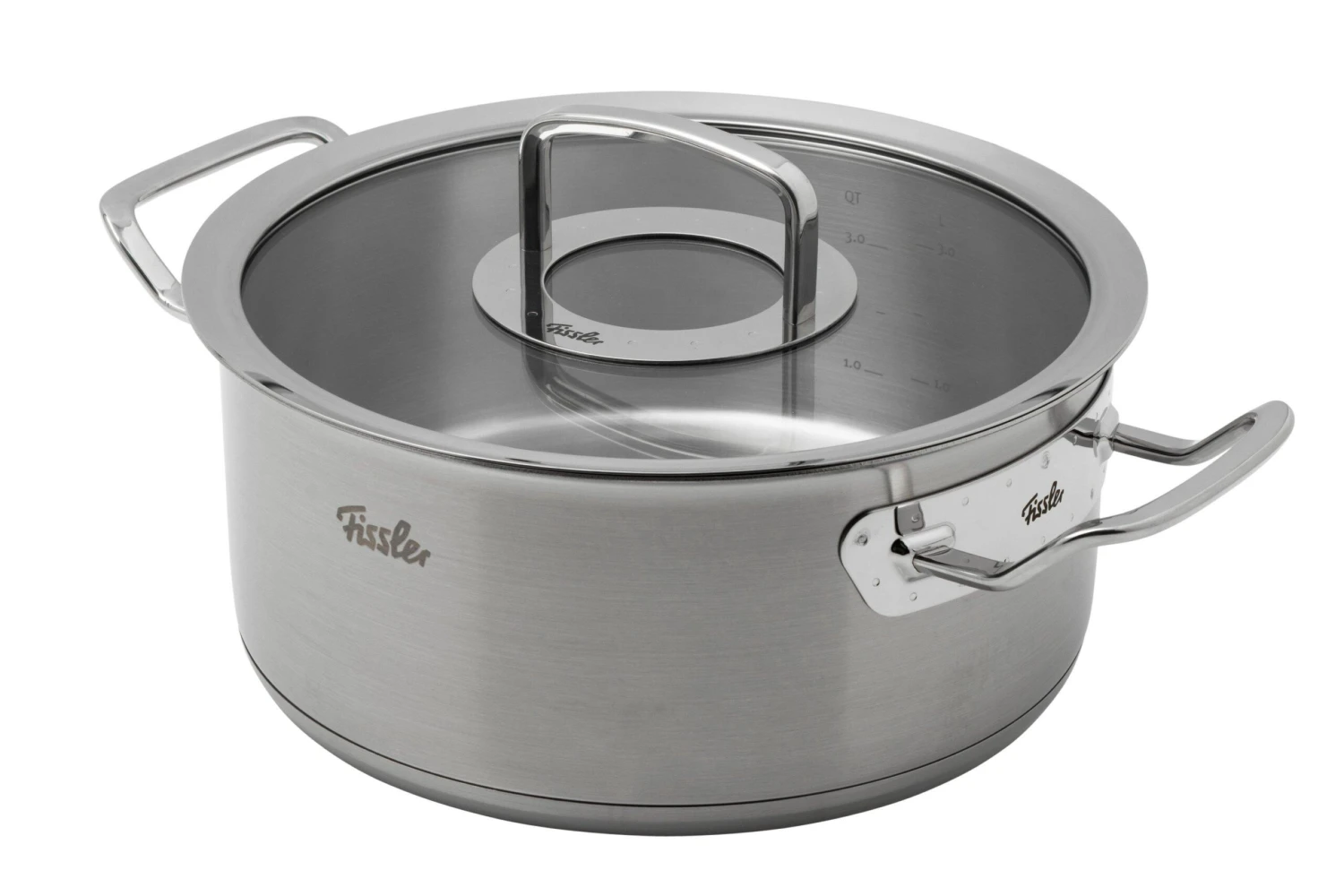 Cette cocotte Fissler Original Pro Collection fait 24 centimĂštres de diamĂštre et peut contenir jusqu’Ă 4,6 litres. La graduation interne va jusqu’Ă 3.0 litres. Elle est livrĂ©e avec un couvercle en mĂ©tal et en verre.