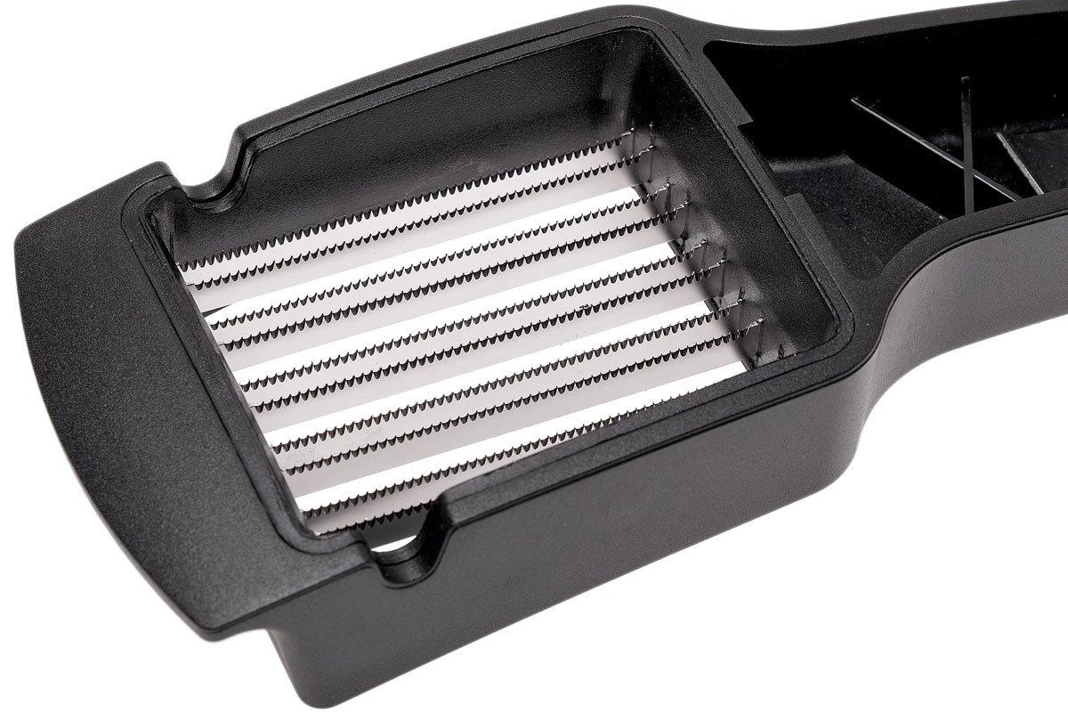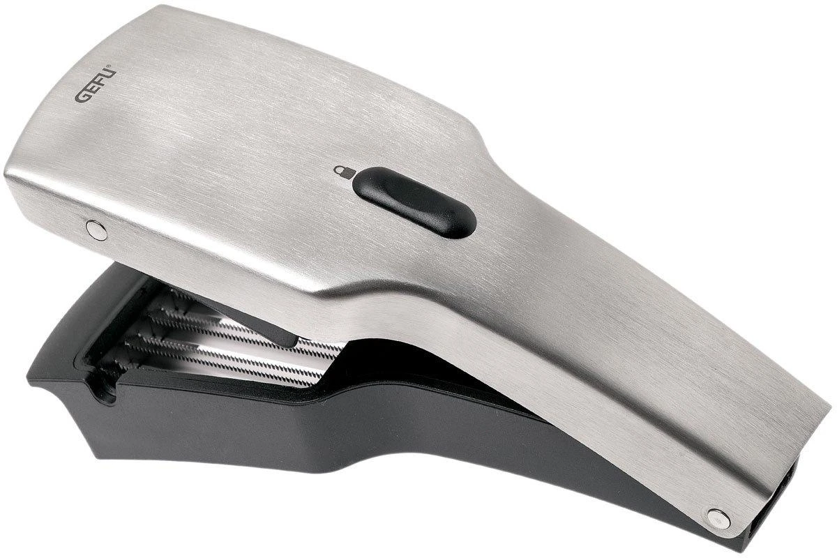 Avec le GEFU Tari, couper les ingrédients devient un jeu d’enfant. Réalisez des tranches parfaites de 5 mm. Rapidement et en toute sécurité. Il convient pour tous les légumes et fruits tendres, tels que les fraises et les raisins, les kiwis mais aussi pour les œufs et la mozzarella. Il ne convient pas aux pommes de terre crues, ni aux oignons, carottes et autres ingrédients durs. Les lames japonaises dentelées sont tranchantes, solides et inoxydables. Autre avantage : ce trancheur se range de façon compacte et sûre grâce à un système de verrouillage pratique. Il suffit de déplier la lame pour la nettoyer. Que ce soit à la main ou au lave-vaisselle.