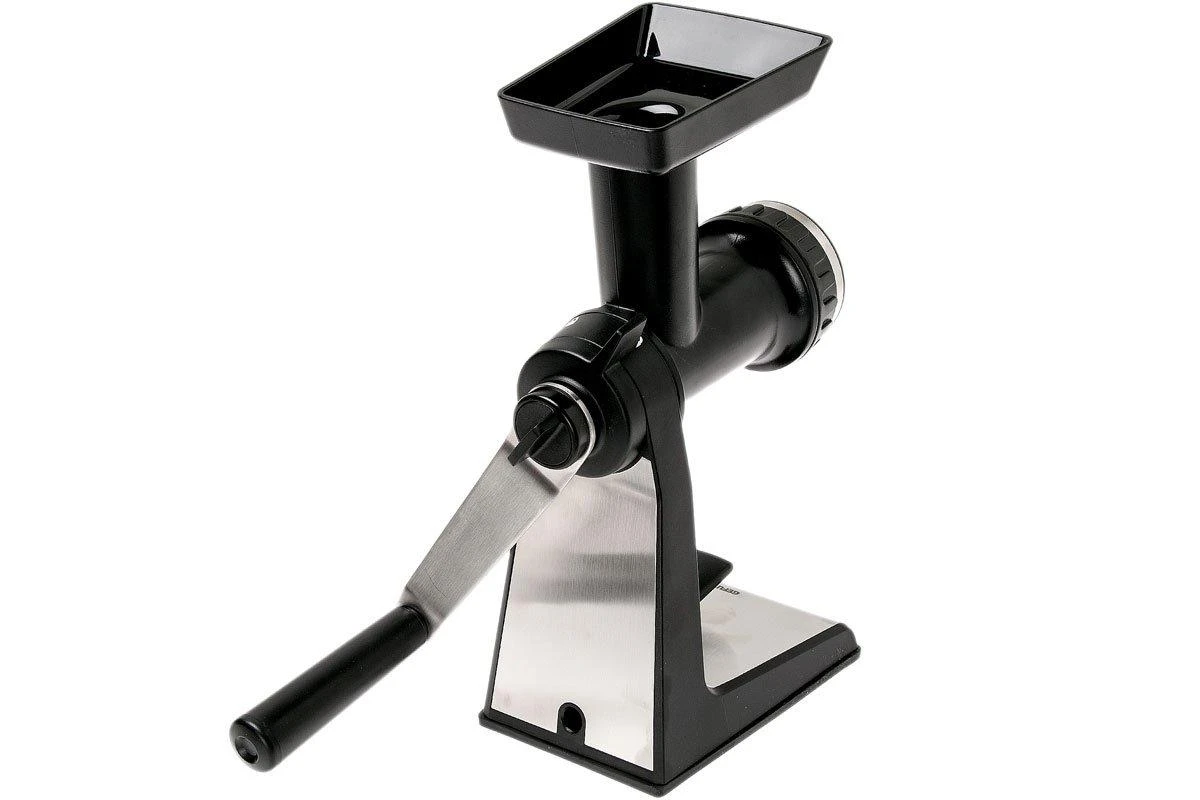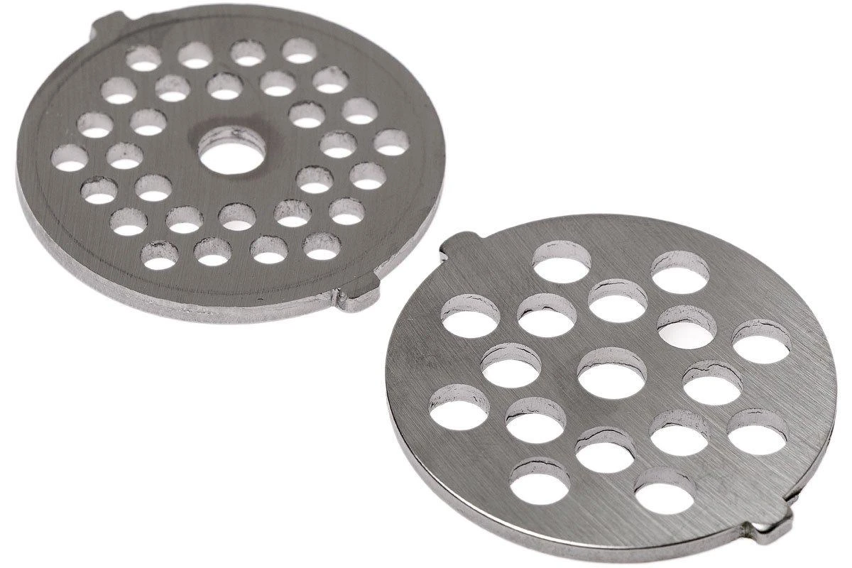 Le GEFU Transforma est équipé de deux disques pour préparer la viande, le poisson et les légumes. L’un des disques est plutôt fin avec des trous de 4 mm, tandis que l’autre est un peu plus gros, avec des trous de 6,5 mm. En plus, le Transforma est doté d’un entonnoir à saucisse.