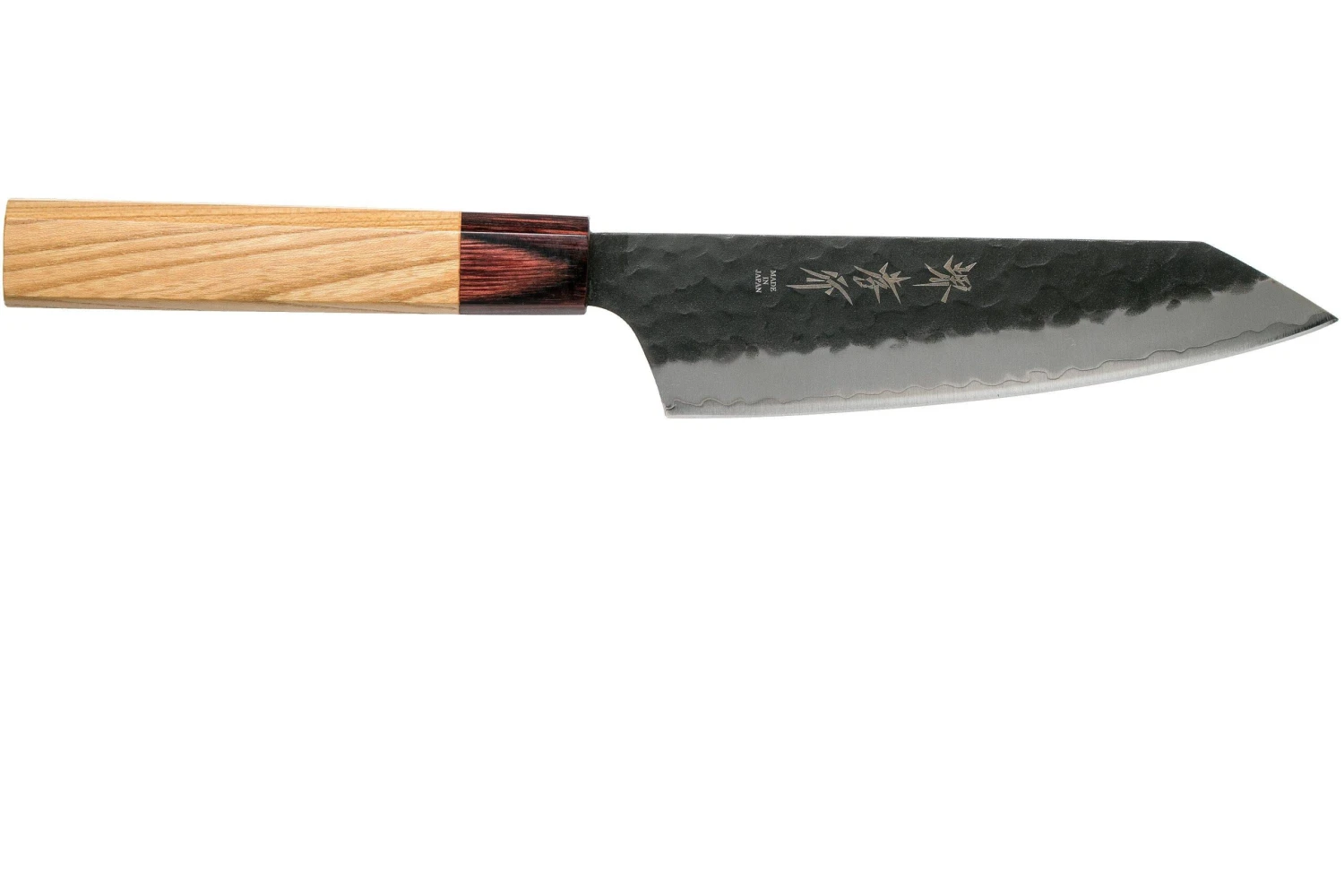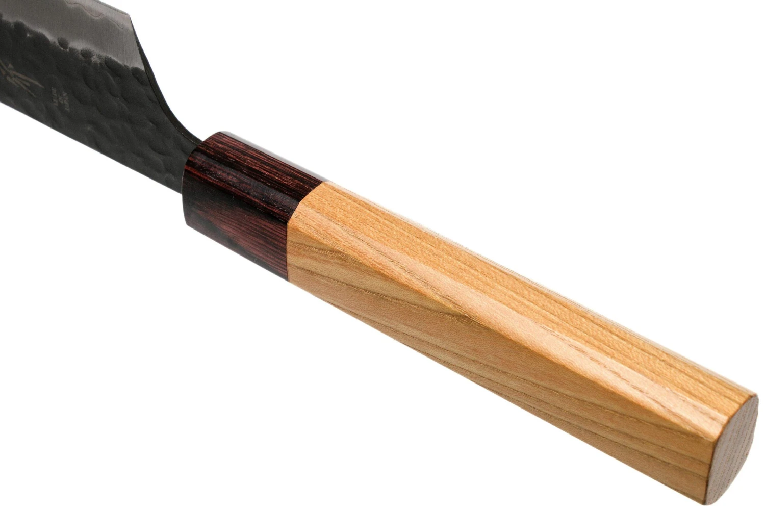 Ce couteau Kengata de la gamme Sakai Takayuki Blue Super a une lame kengata. Ce mot signifie  »lourdement rĂ©flĂ©chi » et fait rĂ©fĂ©rence Ă la forme de la lame qui s’incline brusquement Ă son extrĂ©mitĂ©. Le couteau peut aussi ĂŞtre considĂ©rĂ© comme un membre de la famille des santoku. Grâce Ă sa pointe Ă©troite, vous pouvez couper la viande, le poisson et les lĂ©gumes très finement.