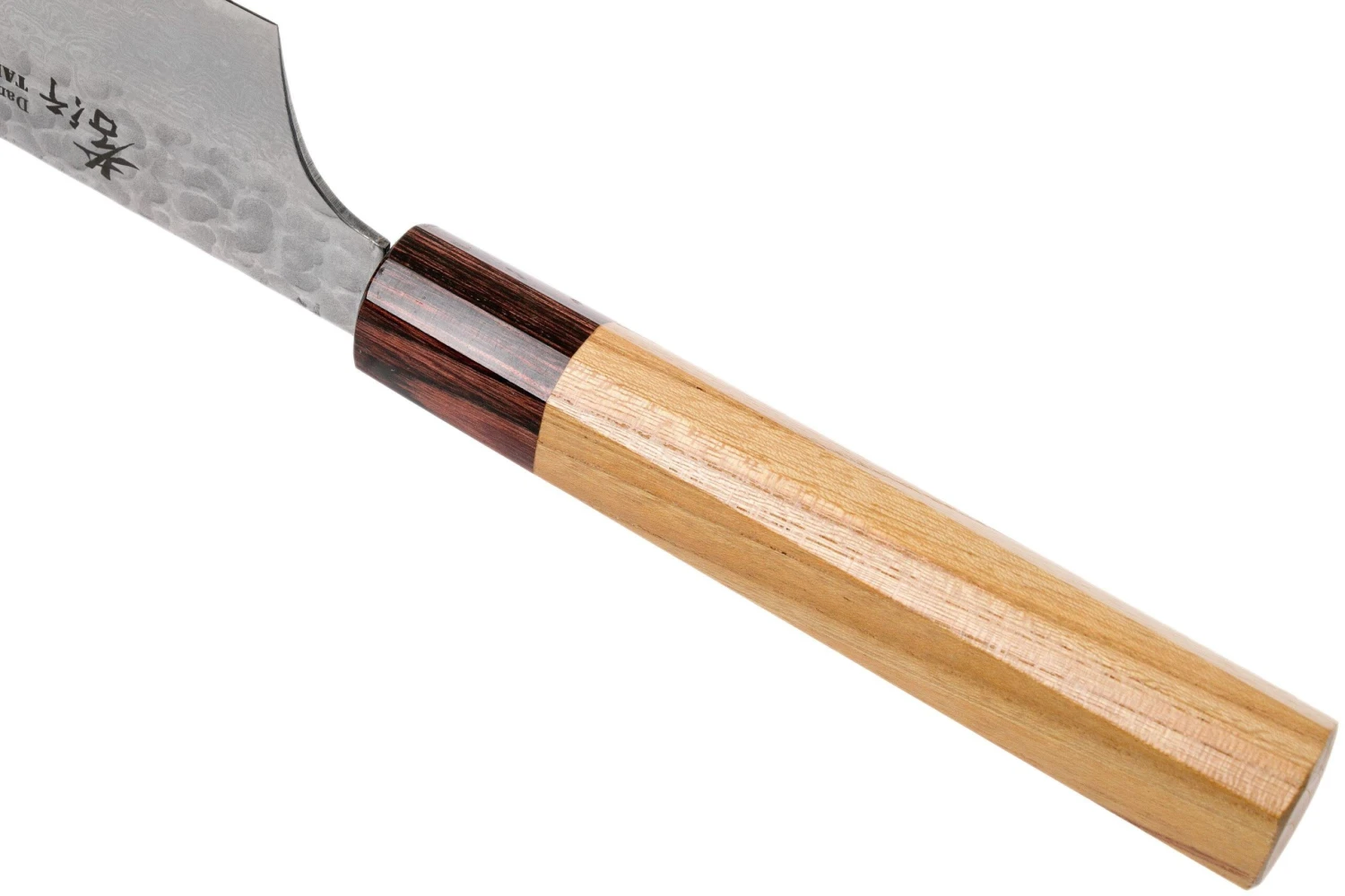 Ce couteau bunka Sakai Takayuki de la gamme 33-layer VG-10 Damascue Hammered WA a une lame kengata. Ce mot signifie »lourdement réfléchi » et fait référence à la forme de la lame qui s’incline brusquement à son extrémité. Ce couteau peur être considéré comme un membre de la famille des santoku. Grâce à sa pointe étroite vous pouvez couper la viande, le poisson et les légumes très finement.