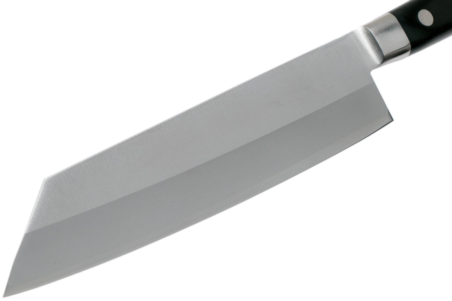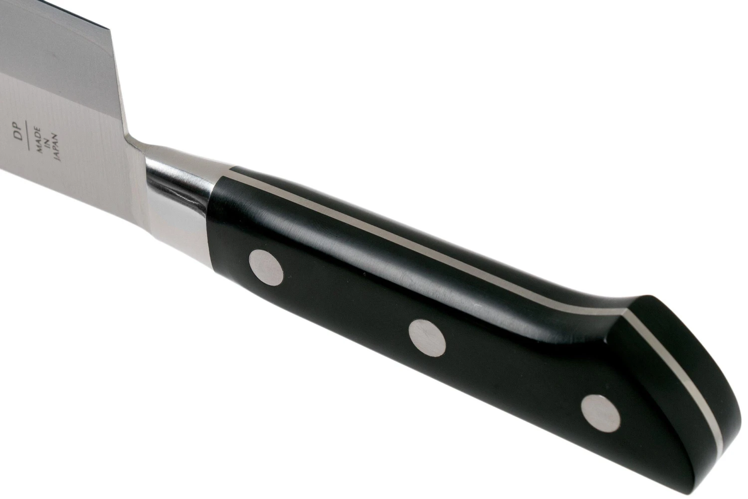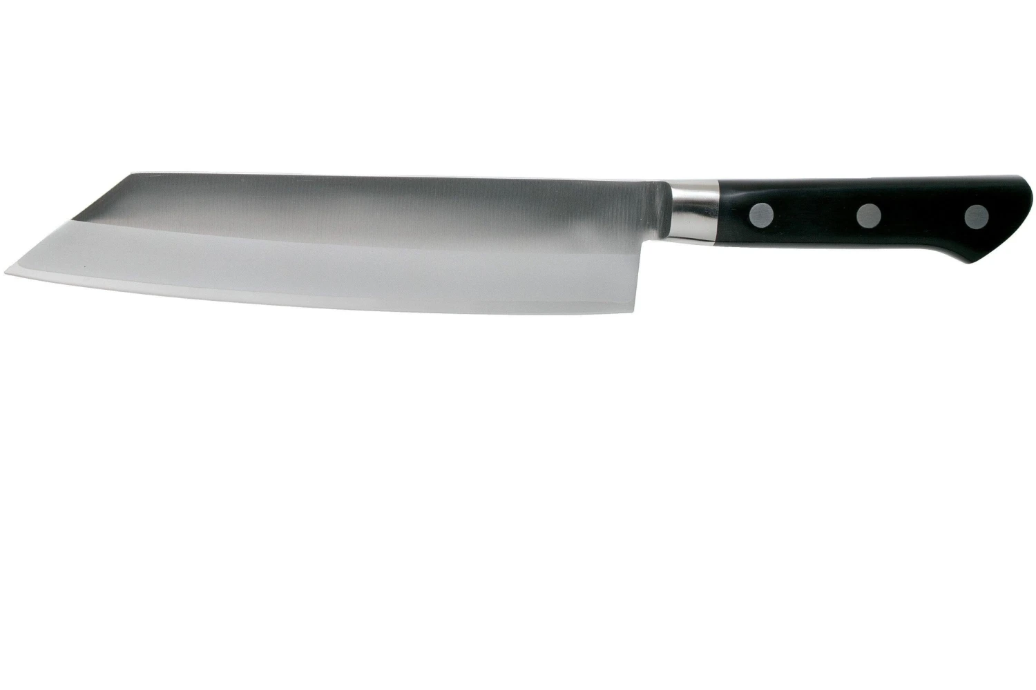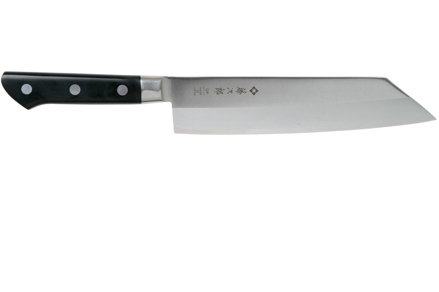 Ce Tojiro DP 3 Kiritsuke est un couteau alliant le design et les caractĂ©ristiques des Usuba et Yanagiba japonais. Un Usaba sert surtout Ă couper les lĂ©gumes, tandis que le Yanagiba est employĂ© pour couper le poisson cru afin de prĂ©parer des sushis, par exemple. Le Kiritsuke est donc gĂ©nial pour diffĂ©rentes utilisations : couper les lĂ©gumes, la viande et le poisson. Le profil tanto inversĂ© du Kiritsuke me rend tr_s agile pour les tâches de dĂ©coupe plus prĂ©cises, mais il est Ă©galement plus vulnĂ©rable. Veuillez note qu’il ne convient pas pour dĂ©couper Ă travers les os.