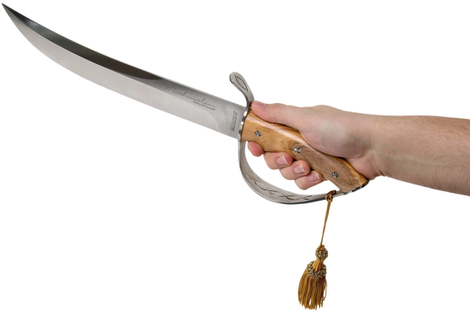 Le Viper Mathusalem est un sabre à champagne pour toutes les occasions spéciales. Ce sabre se laisse remarquer. La lame en acier 4034 n’est pas aiguisée tranchante. L’acier 4034 est un acier classique typique de la capitale des couteaux allemande, Solingen. Très dur et résistant à la rouille. La manche est fait dans une pièce d’olivier massif. Solidement fixé à la lame par des rivets polis. La manche est doté d’une dragonne ocre assortie Pour parfaire le tout, ce sabre est livré dans un coffret en bois qui peut aussi servir de présentoir. A table ou accroché au mur, c’est une véritable œuvre d’art. Évidemment, un certificat d’authenticité est livré avec ce Viper Mathusalem.